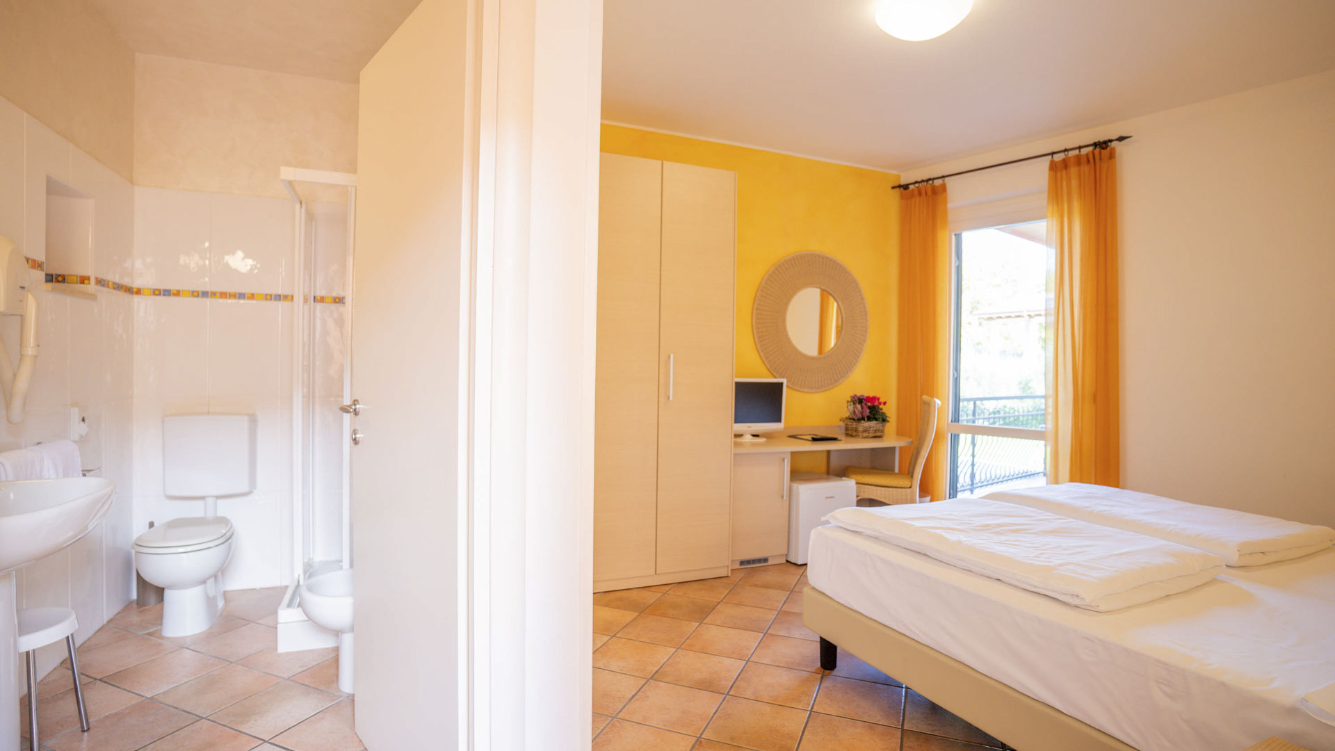 Camere con letto matrimoniale situate al primo e al secondo piano con balcone affacciato sul giardino o sulla piscina, ampia e curata nei dettagli. Dispone di TV-SAT, aria condizionata e bagno privato.
