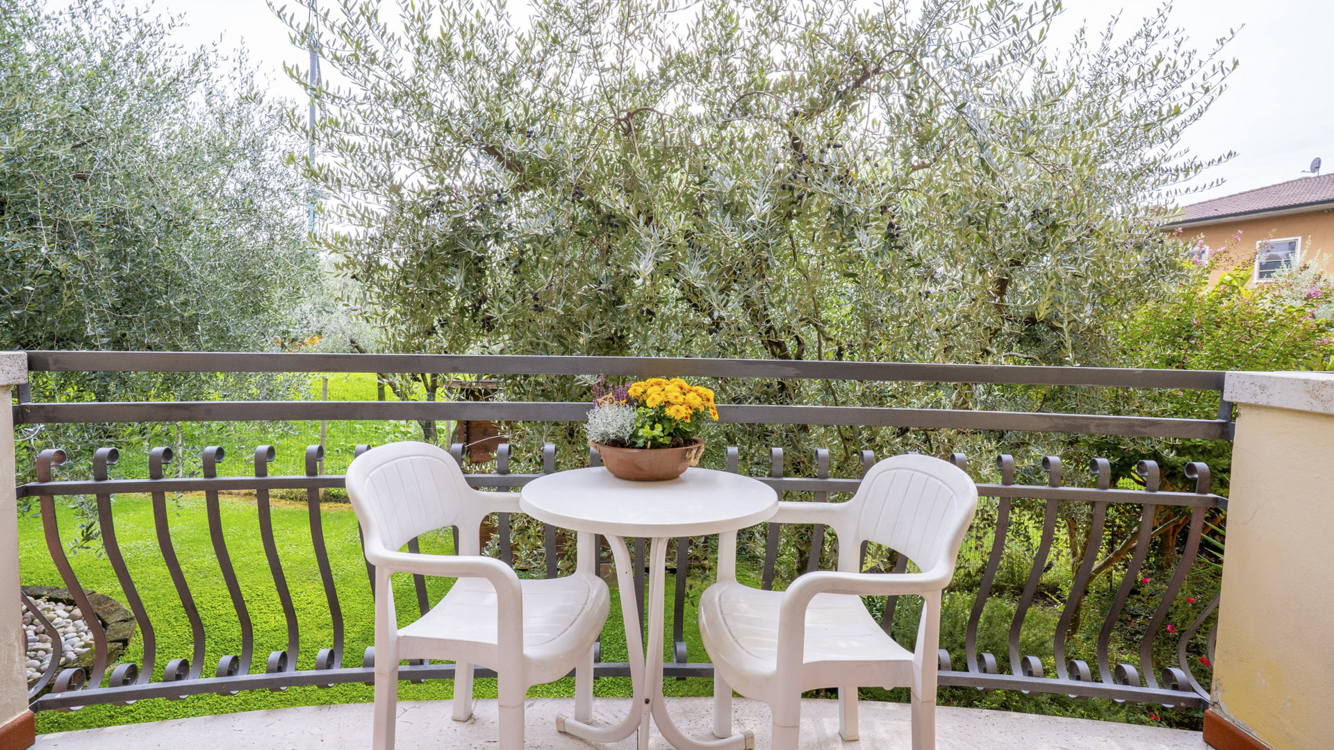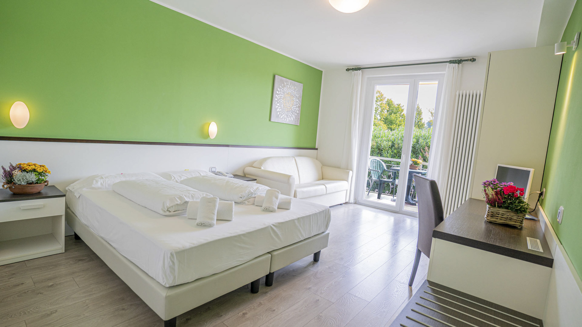 Camere con letto matrimoniale situate al primo o al secondo piano con balcone privato con affaccio sul giardino.